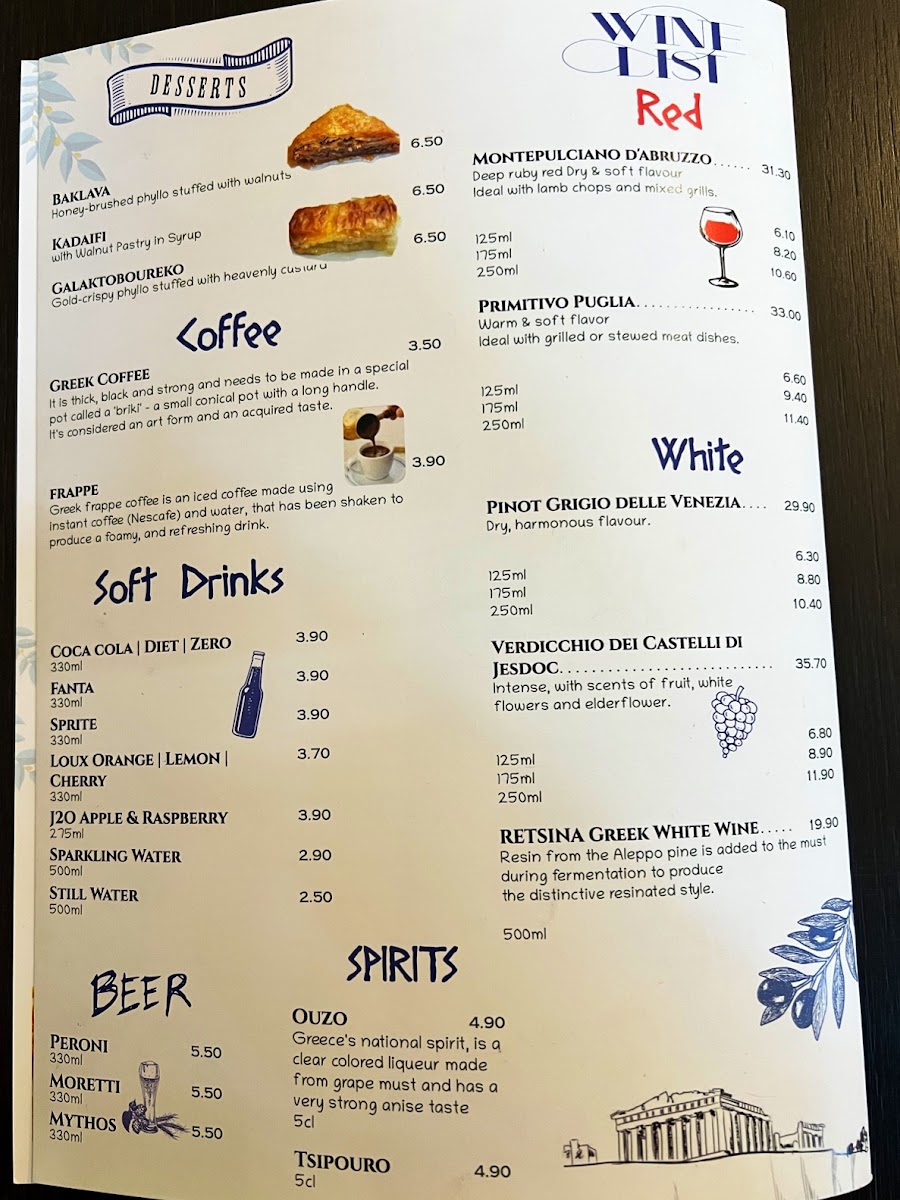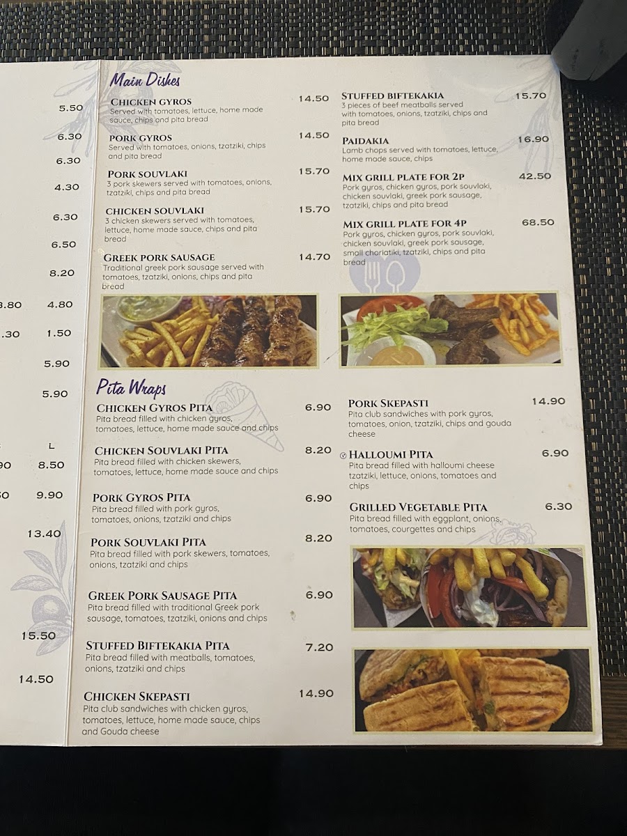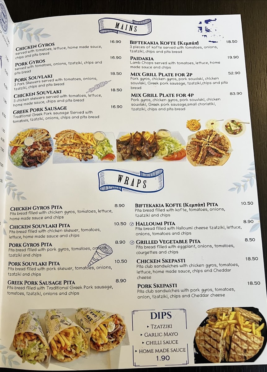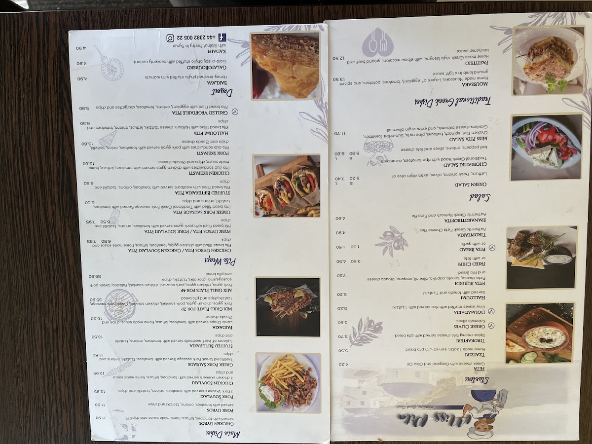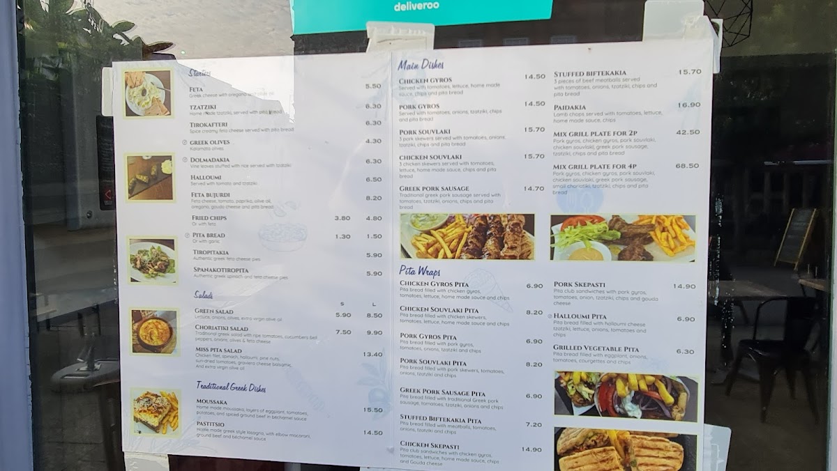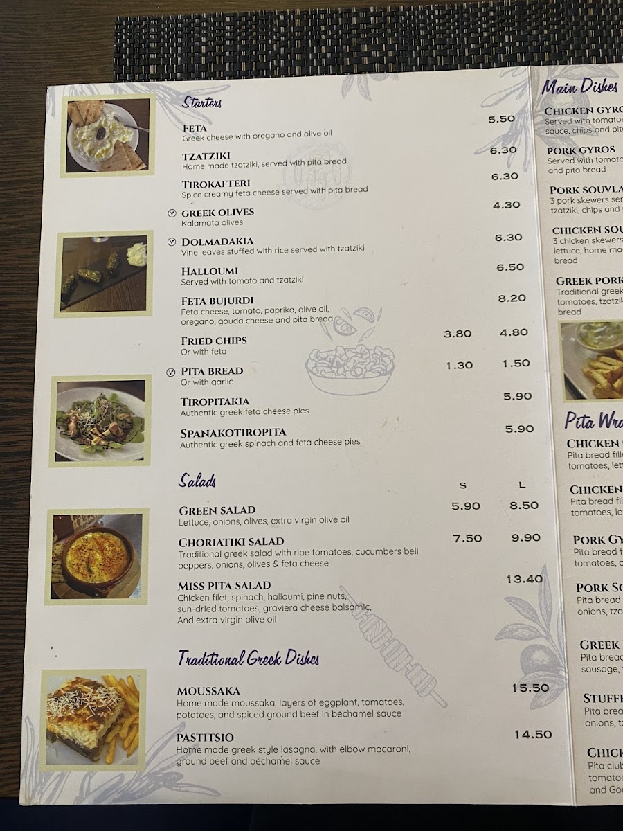 The menu at Miss Pita offers a delightful array of authentic Greek dishes, ideal for both casual bites and hearty meals. For starters, patrons can enjoy dishes such as Feta, Tzatziki, and the spicy Tirokafteri, all perfect for sharing. The Greek Olives and Dolmadakia add a touch of Mediterranean tradition to the beginning of the meal. Moving to the main dishes, the Chicken Gyro and Pork Gyros stand out, alongside the flavorful Pork Souvla and Chicken Sou. For those craving something more substantial, the Greek Pork is a flavorful option. The salads are refreshing, with the Choriatiki Salad being a classic choice, and the Miss Pita Salad offering a unique twist. The traditional Greek dishes like Moussaka and Pastitsio bring rich, comforting flavors to the table. The pita wraps are a standout, featuring options like the Chicken Gyros Pita and Pork Souvlaki Pita, all perfect for a lighter yet satisfying meal. Other unique offerings include the Greek Pork Sausage Pita and the savory Pork Skepasti, rounding out the variety of options on the menu.